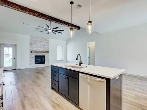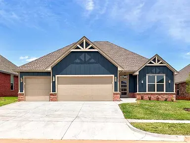 Discover this stunning new home in Mustang Schools! This exceptional property is full of charm and modern design. The unique floor plan features a main living area with a tall, wooden-beamed ceiling, a cozy fireplace, and an open connection to the kitchen and dining area. The kitchen is a standout with chic paint colors, quartz countertops, a spacious island, built-in microwave, gas range, and an oversized walk-in pantry. The luxurious main suite includes a beautiful bathroom reminiscent of a high-end resort, and a large walk-in closet with convenient access to the laundry room. Three additional bedrooms provide ample space, with one featuring its own private bathroom, and a third full bath serving the remaining bedrooms. The third bedroom can easily be transformed into a home office. The expansive front porch and back patio offer perfect spots for relaxation. With access to OKC utilities, close proximity to the Hobby Lobby Headquarters, and easy access to major highways, this neighborhood is an ideal place to call home. Don't miss out on this remarkable home where elegance meets practicality. Another fantastic quality built home by J.P. Gibbons. Buyer to verify schools.